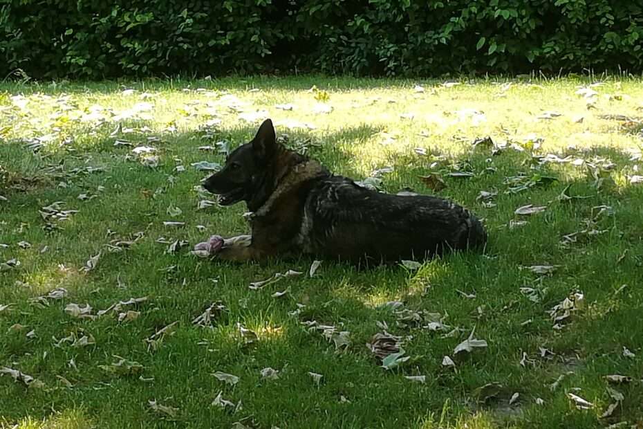 Samen hebben we uren vertoefd bij haar in de tuin, op wandel of bij haar binnen in huis. Een van de laatste wandelingen die we gedaan hebben aan de lange lijn, ‘rende ‘ ze plots weg, begon ze te snuffelen in het hoge gras. Omdat er vossen, reeën en andere dieren daar zitten, dacht ik dat ze een wildspoor aan het volgen was. Ik liet ze haar gangetje gaan. Tot ze plots op iets aan het kauwen was. Nog net zag ik dat het een sandwich was. Zonder charcuterie. Gewoon een volledige sandwich! Afpakken… dat doe je niet bij een Herdershond. Dus gewoon bang afwachten en hopen dat ze dit overleefde. En ja hoor, onze kwieke dame stond ’s ochtends vrolijk te kwispelen om nog een wandeling. Blijkbaar had een vogel ergens bij geitjes of zo een sandwich gepikt en laten vallen. Het blijft een raadsel.